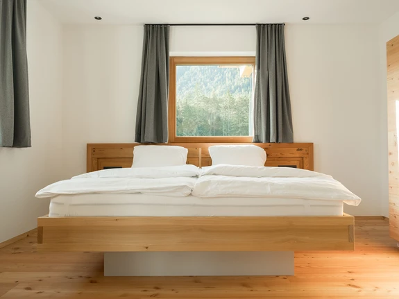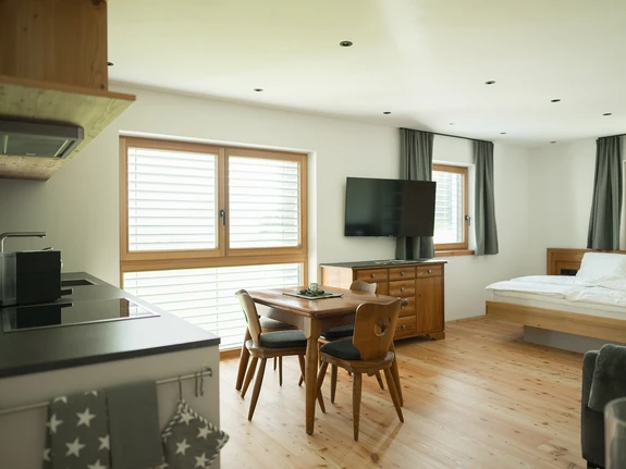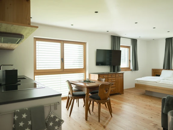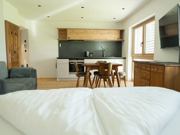 Das Appartement ist nach Osten/Süden ausgerichtet und ist ausgestattet mit Doppelbett, ausziehbarer Couch für 3.+4. Person und Flat–TV.