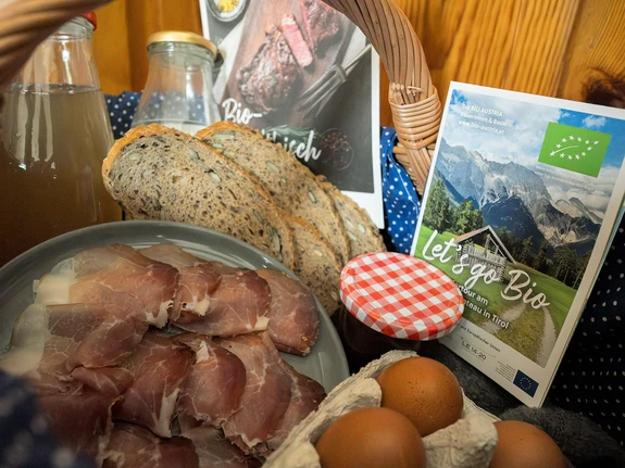 Frische Milch, Eier von unseren Hühnern, frisch gebackenes Bauernbrot, hausgemachte Marmelade, Butter und Speck - sowie hauseigenen Bio-Apfelsaft.