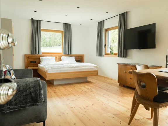Das Wohn/Schlafzimmer für 2 Personen ist ausgestattet mit einem Doppelbett und einem hochwertigen Schlafsofa für 2 weitere Personen sowie Flat–TV.