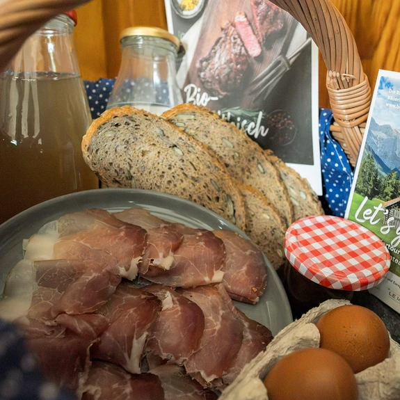 Frische Milch, Eier von unseren Hühnern, frisch gebackenes Bauernbrot, hausgemachte Marmelade, Butter und Speck - sowie hauseigenen Bio-Apfelsaft.
