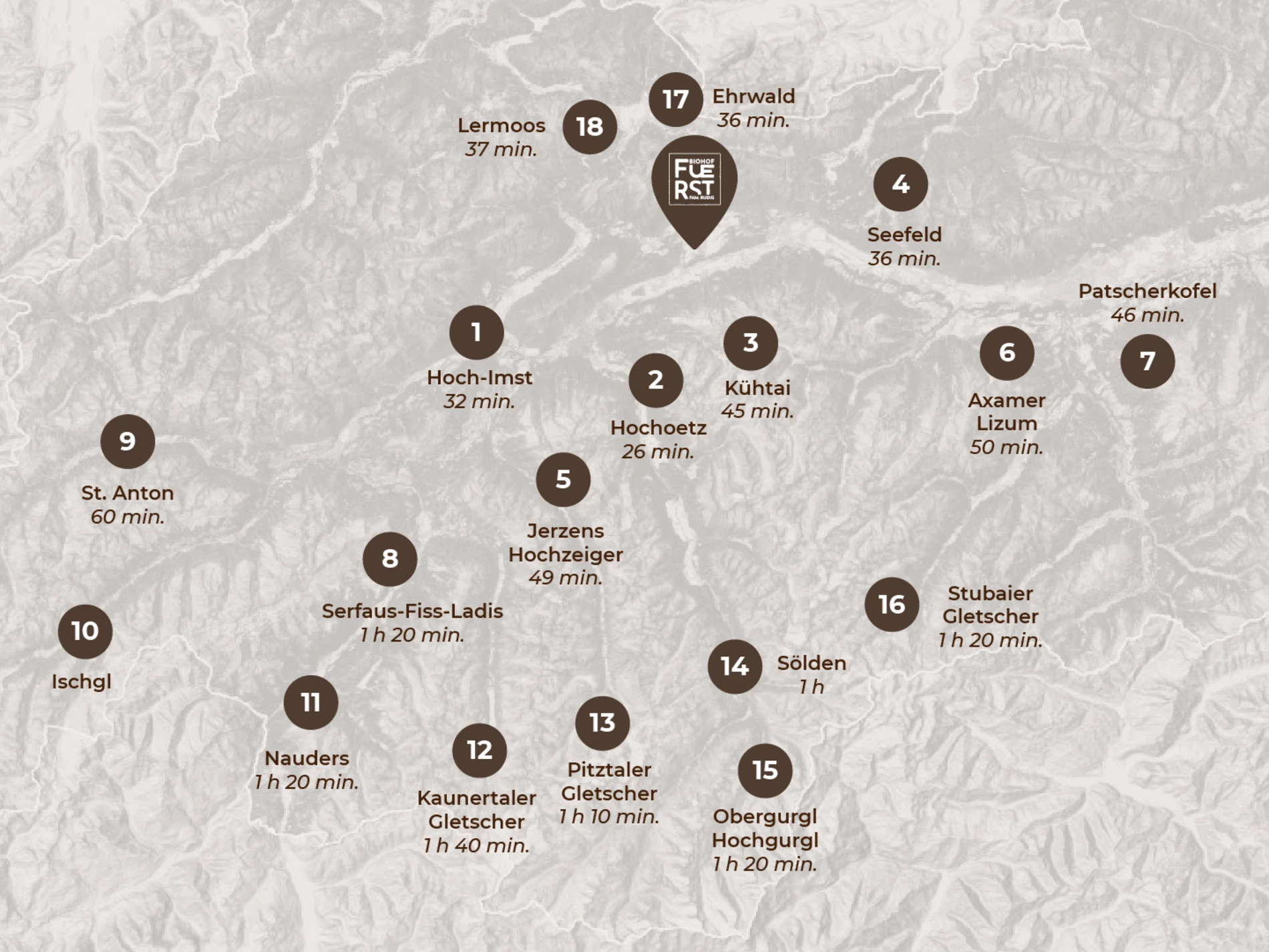 Die besten Skigebiete, wie beispielsweise Sölden, Ischgl, Serfaus-Fiss-Ladis und der Pitztaler Gletscher, sind schnell und bequem mit dem Auto oder den öffentlichen Verkehrsmitteln zu erreichen.