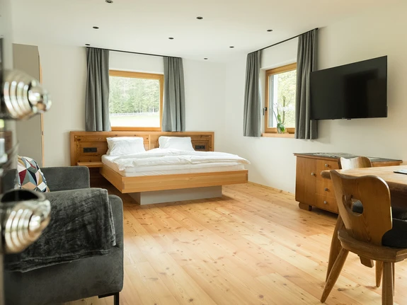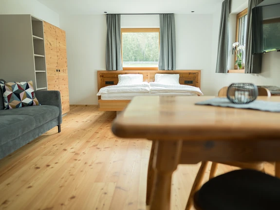 Das Wohn/Schlafzimmer für 2 Personen ist ausgestattet mit einem Doppelbett und einem hochwertigen Schlafsofa für 2 weitere Personen sowie Flat–TV.