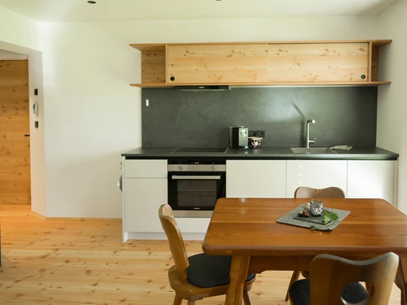 Die Wohnküche ist voll ausgestattet mit Spülmaschine, Elektroherd mit 4 Kochfeldern, Backrohr, Kühlschrank mit Gefrierfach, Pad-Kaffeemaschine und Geschirr.